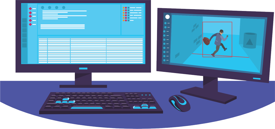 Projetado para duas telas simultâneas, todos os dados do cliente, usuários, contatos, informações e controles do sistema de alarme ou acesso, imagens com fotos e vídeo ao vivo ou gravado.